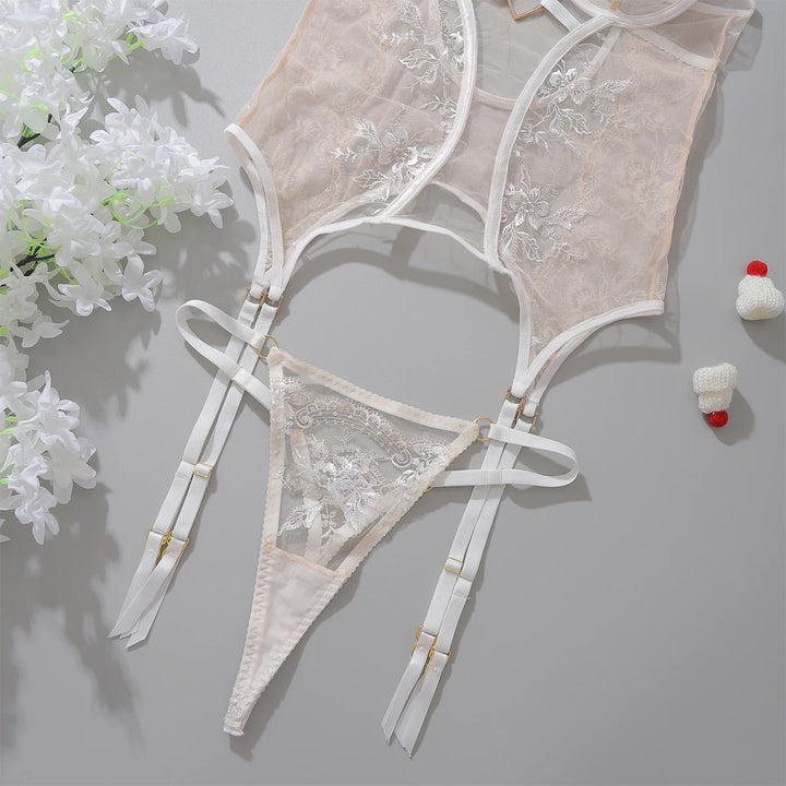 Vous vous sentirez sexy et confiante, prête à affronter toutes les occasions passionnantes qui se présentent à vous avec cette guêpière transparente fleurie et cette culotte érotique en maille fine.